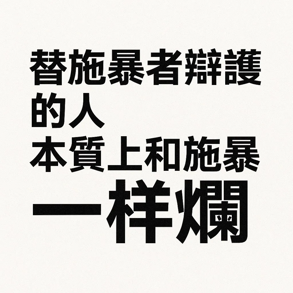 很多人喜歡在家暴、性侵、騷擾、偷拍、不當凝視事件後替施暴者找理由。你會看到他們說:「他有悔意」、「他只是失控」、「都是受害者的錯」……這些都是典型的合理化策略。施暴者在動手的那一刻,就已經越界,無論他